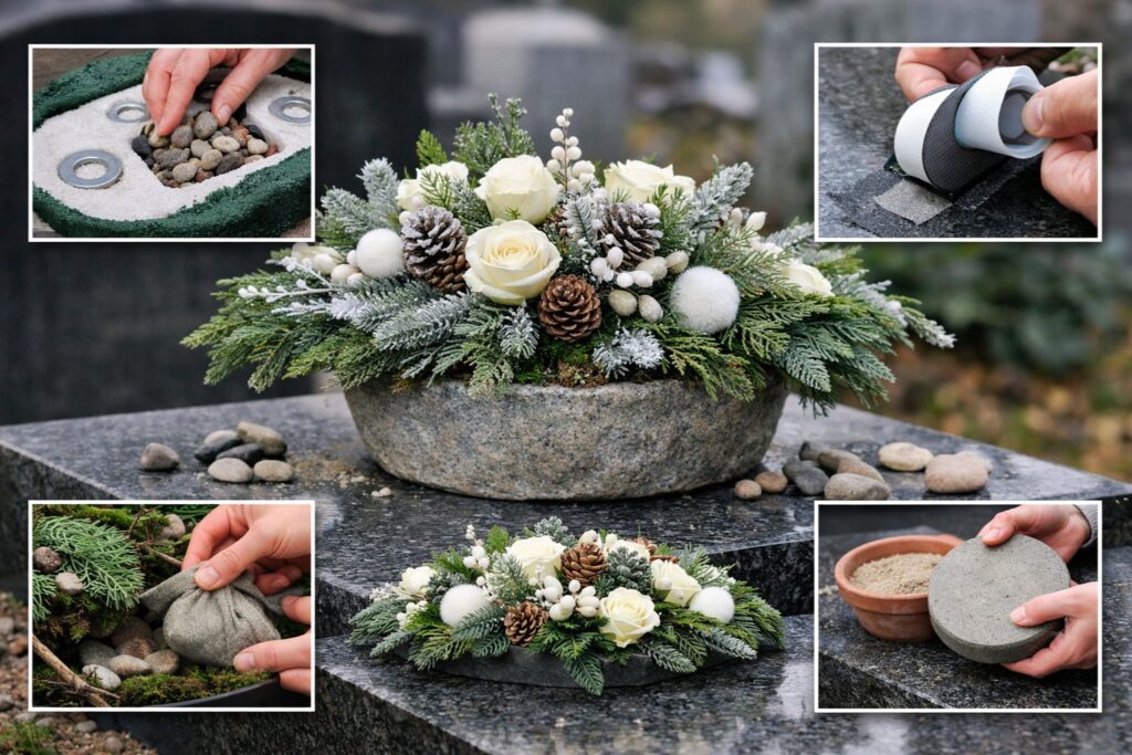 Silny wiatr bardzo często przewraca lub przesuwa dekoracje nagrobne. Problem dotyczy szczególnie lekkich stroików sezonowych, które mają dużą objętość, ale niewielką wagę. W efekcie nawet umiarkowany podmuch może zniszczyć kompozycję albo zrzucić ją z płyty nagrobnej. Dobrze dobrane obciążenie sprawia, że stroik pozostaje stabilny, wygląda estetycznie i nie wymaga ciągłego poprawiania. Poniżej znajdziesz konkretne, sprawdzone metody stosowane zarówno przez osoby prywatne, jak i florystów.