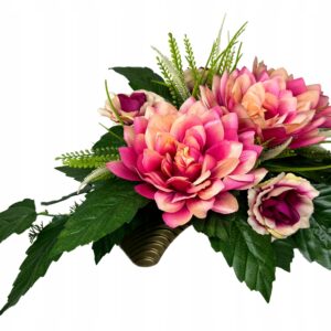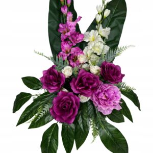 Elegancka dekoracja cmentarna w okrągłej donicy, stworzona z dbałością o każdy detal. Wykonana z wysokiej jakości tworzyw sztucznych, które wiernie odwzorowują wygląd żywych kwiatów. Dzięki solidnej konstrukcji i odporności na warunki atmosferyczne, kompozycja zachowuje swój estetyczny wygląd przez długi czas.
